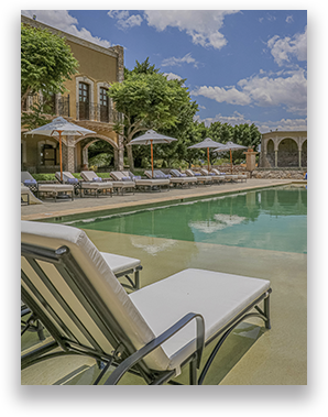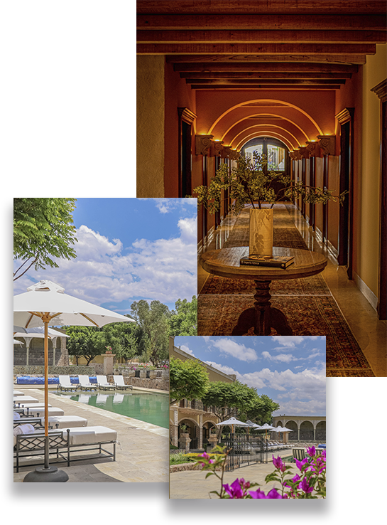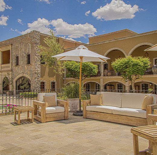 En el corazón de la hacienda, el patio central, un espacio bañado por la luz natural, sus arcos majestuosos y su fuente de talavera y cantera que alberga una magnolia y árboles de olivo, el lugar perfecto para consentirte y dejarte llevar por los colores, olores y sonidos de la fuente.